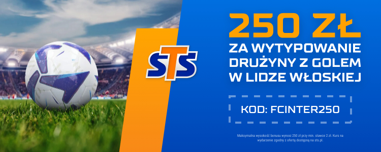 Czołowy polski bukmacher STS przygotował niezwykłą dla użytkowników serwisu fcinter.pl. Zawiera klasyczne bonusy na start (opisane poniżej) oraz specjalny bonus. Gdy postawisz zakład na gola Interu w meczu z Milanem, a typ okaże się trafiony, oprócz standardowej wygranej otrzymasz jeszcze 250 PLN. Wystarczy, że postawisz przynajmniej 2 PLN. Jak łatwo obliczyć, kurs przy takiej stawce wynosi aż 125.0!