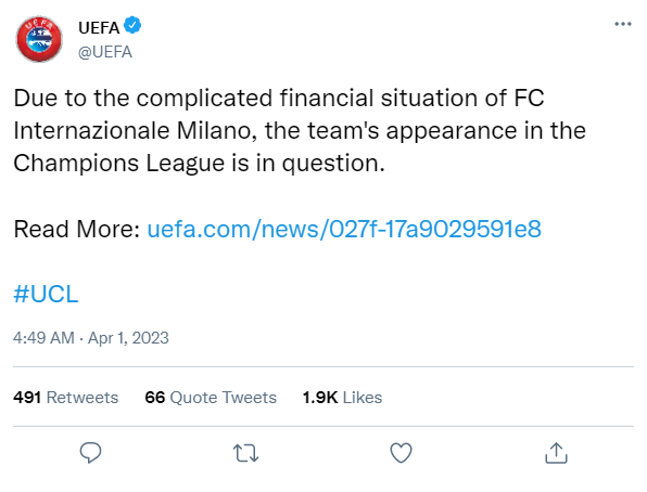 Włoskie media rozgrzane do czerwoności! UEFA za pośrednictwem swojej oficjalnej strony oraz mediów społecznościowych poinformowała, że Inter Mediolan jest zagrożony wykluczeniem z gry w Lidze Mistrzów! Powodem jest oczywiście słaba sytuacja finansowa klubu. Nerazzurri mają tydzień na apelację i przedstawienie rozwiązania sytuacji.