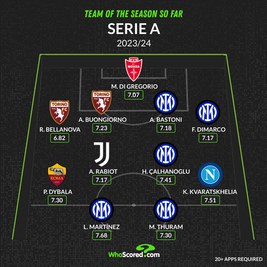 Whoscored, znany serwis specjalizujący się w statystykach, utworzył po 29. kolejkach Serie A najlepszą jedenastkę ligi. W zestawieniu tym znalazło się miejsce dla pięciu zawodników Interu: Bastoni (7,18) i Dimarco (7,17) w obronie, Calhanoglu (7,41) w pomocy oraz obaj napastnicy - Lautaro Martinez (7,68, najlepsza średnia ocen z całej jedenastki) i Marcus Thuram (7,30).